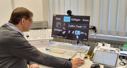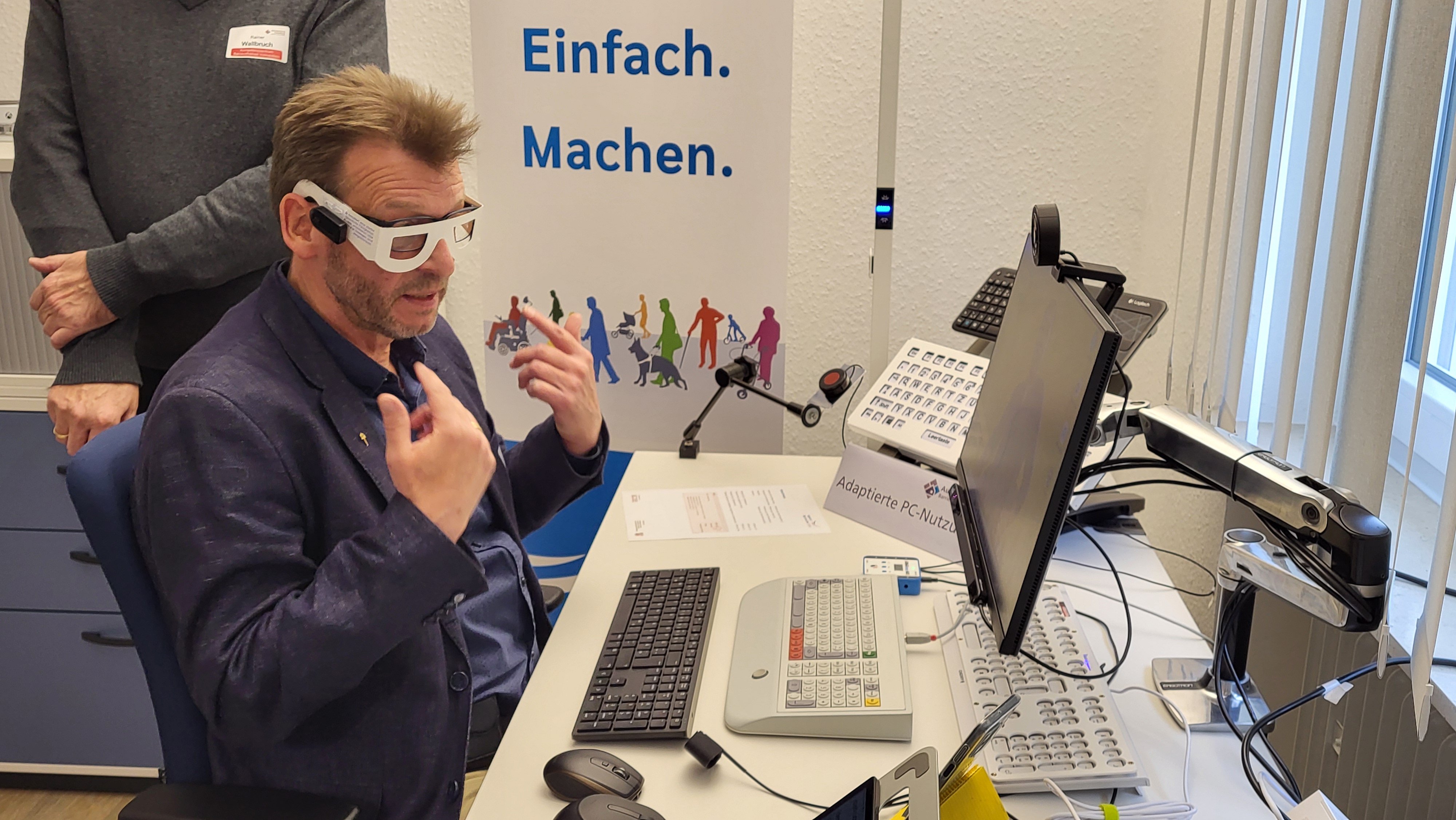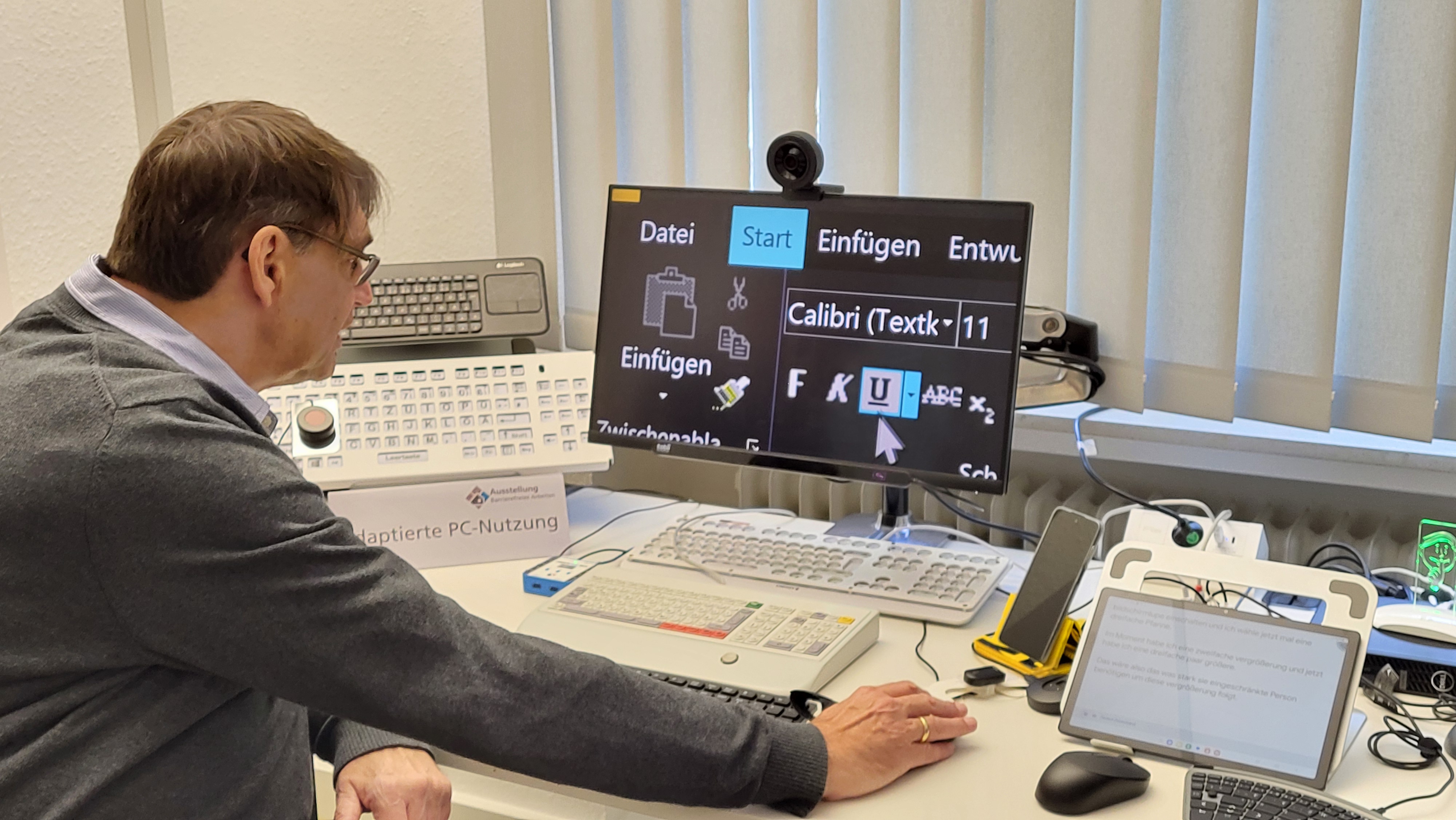 Michael Hubert von der Agentur Barrierefrei NRW erklärt das Arbeiten am PC mit einer Kopfmaus
