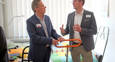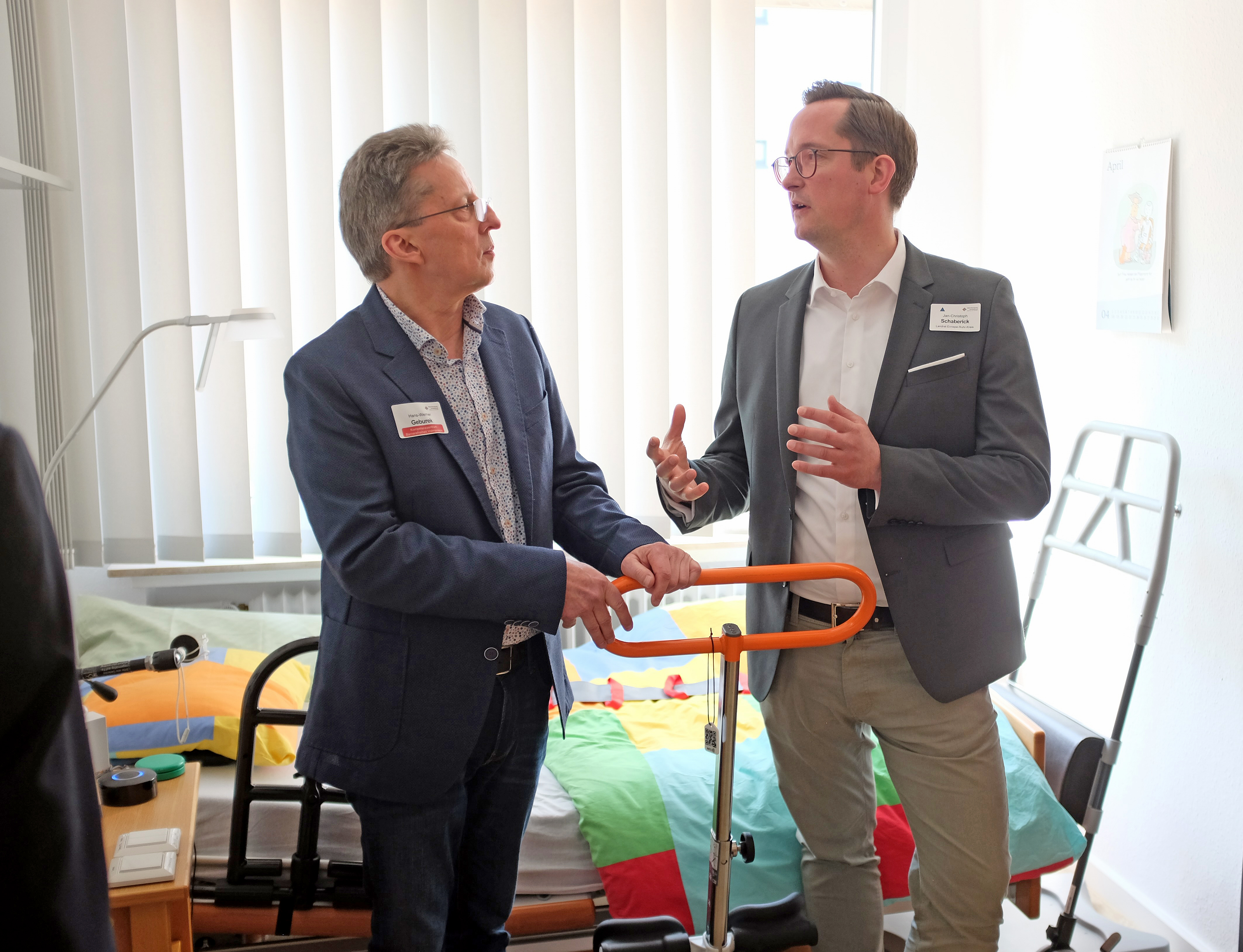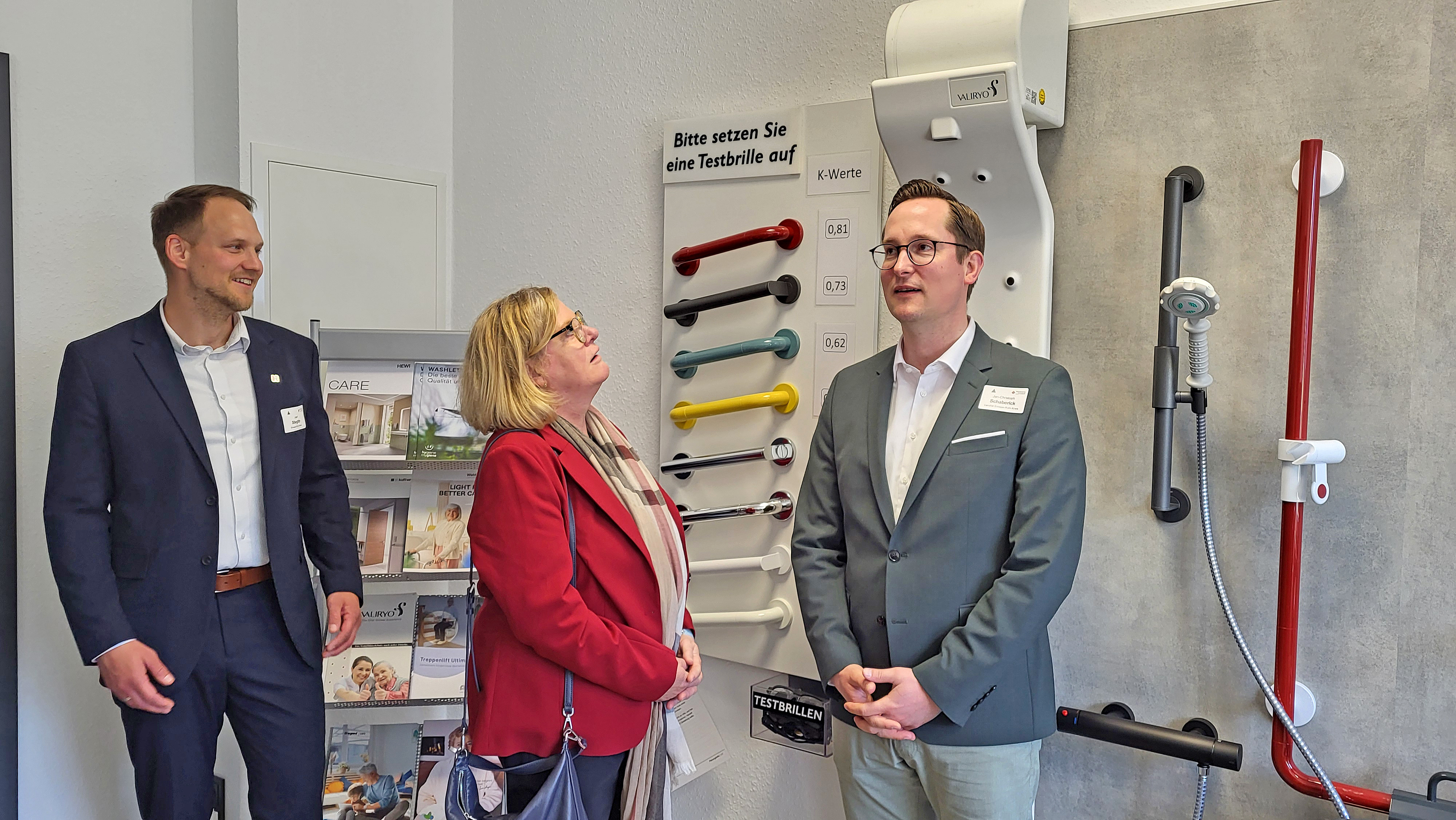 Wohnberater Hans-Werner Geburek (li.) zeigt Landrat Jan-Christoph Schaberick verschiedene Hilfsmittel für die Betreuung von pflegebedürftigen Menschen -