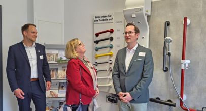 Landrat Jan-Christoph Schaberick (re.) und die stellvertretende Bürgermeisterin und MdL Kirsten Stich probieren den Körperföhn aus, der nach dem Duschen Menschen mit Behinderung hilft, sich zu trocknen (links: Joel Stieglitz vom Ennepe-Ruhr-Kreis) -