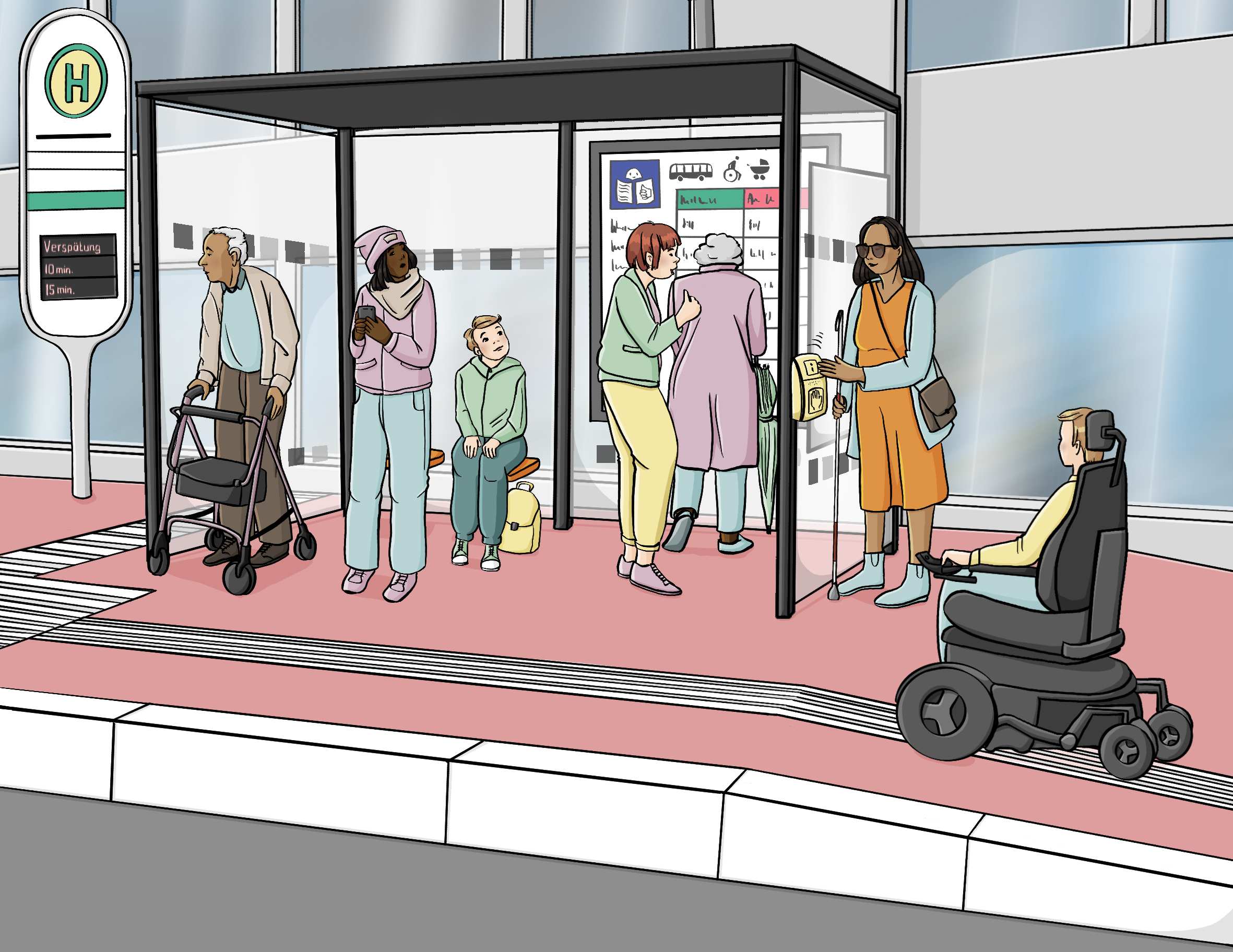 Der Witterungsschutz muss sicher erkannt werden können, deshalb müssen die Seitenwände aus Glas visuell kontrastreich gestaltet werden. Innerhalb des Witterungsschutzes hängen in der Regel die Aushangfahrpläne. Wie Aushanginformationen beschaffen sein müssen, erfahren Sie in dem Umsetzungstipp Orientierung im Verkehrs- und Freiraum. Und die Informationen zu Sitzgelegenheiten in dem Umsetzungstipp Ausstattungselemente im Verkehrs- und Freiraum.